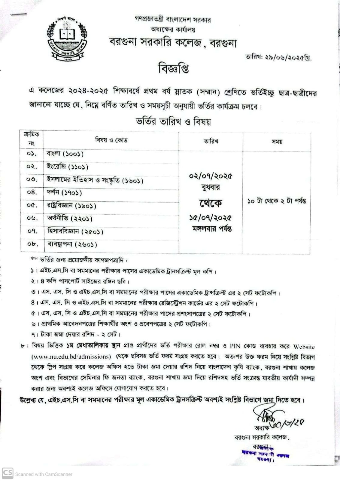 বরগুনা সরকারি কলেজের 2024-2025 শিক্ষাবর্ষের স্নাতক (সম্মান) প্রথম বর্ষ ভর্তির নোটিশ