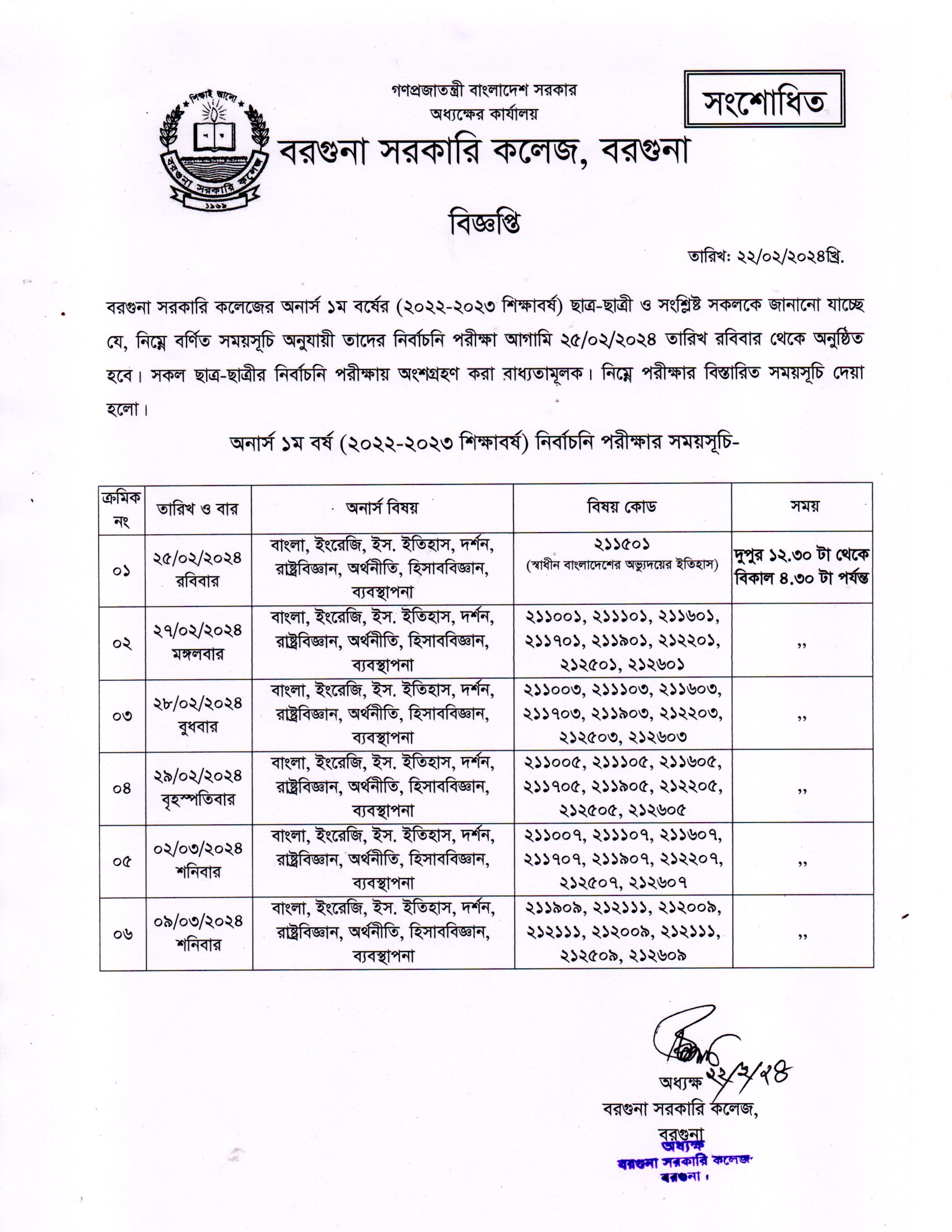 অনার্স প্রথম শিক্ষাবর্ষ (শিক্ষাবর্ষ : 2022-2023) নির্বাচনি পরীক্ষার সময়সূচি